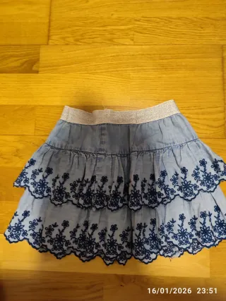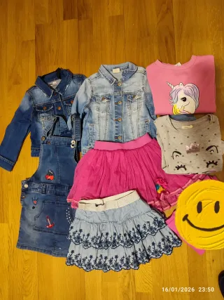 Lote de ropa para niña en talla 5-6 años. Incluye varias prendas. - Chaqueta vaquera - Peto vaquero - Falda rosa - Falda vaquera - Sudadera rosa con unicornio - Sudadera gris con cara de gatito