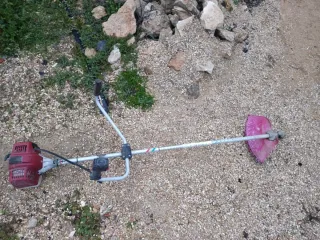 Desbrozadora de gasolina con motor rojo y protector rosa.se calienta y se para,por eso la dejamos parada,es probablemente la bobina,pero compramos otra y no sé reparo.de ahí su precio - Mango ergonómico. - Barra de transmisión metálica.