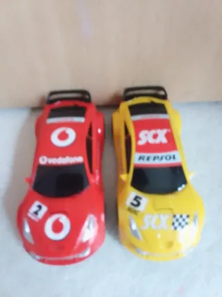 Dos coches de slot SCX, uno rojo y otro amarillo, listos para la acción en circuitos. - Coche rojo con dorsal '2' y logo de Vodafone. - Coche amarillo con dorsal '5' y logo de Repsol. - Ambos coches son de la marca SCX.