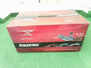 Caja Scalextric Pit Box del sistema digital. Con 6 coches y 6 mandos ,solo utilizado en una ocasión - Incluye el sistema digital. - Permite competir con 3 coches a la vez. No ofertas