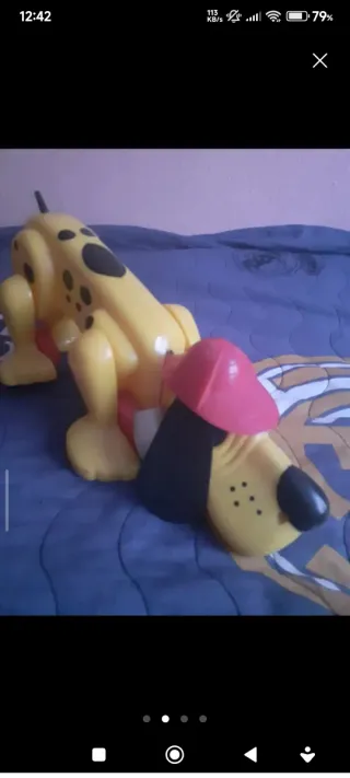 Perro de juguete de color amarillo brillante con manchas negras. Tiene una gorra roja y una lengua gris.años 70 34 cm - Diseño divertido y colorido. - Material de plástico resistente.
