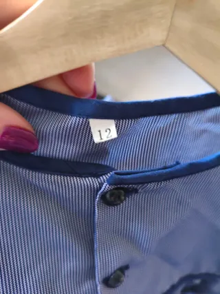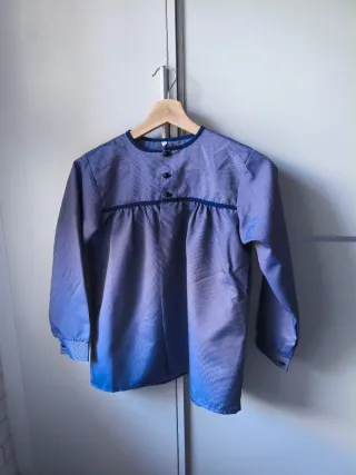 Blusón tradicional de tela azul con detalles en azul marino, ideal para fiestas falleras. - Cuello redondo con ribete. - Cierre de botones en la parte delantera. - Mangas largas con puño.