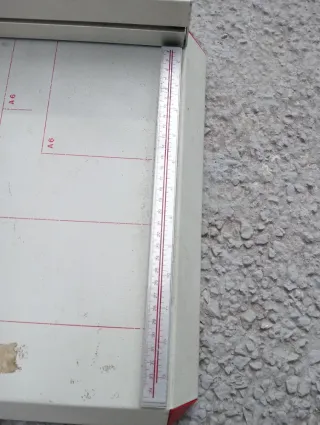Cizalla de papel marca Yosan, modelo 35. Ideal para cortes precisos. - Base de corte con guías impresas para diferentes tamaños. - Regla lateral metálica para ajustes finos. - Cuchilla afilada para un corte limpio.