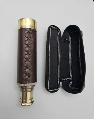 Precioso catalejo extensible de estilo clásico/náutico. Ideal para decoración, coleccionistas o como regalo original. -Material: Acabado en latón dorado y cuerpo forrado en piel/cuero marrón con pespuntes decorativos. -Estado: Bien conservado y funcional (lente ajustable). -Incluye: Funda rígida de transporte con cremallera y asa para cinturón. -Medidas: 35cm extendido y plegado 15cm. Un objeto muy vistoso para estanterías, despachos o para amantes de la navegación. #catalejo #nautica #vintage #decoracion #coleccionismo #retro #pirata #telescopio #antiguedades #regalo