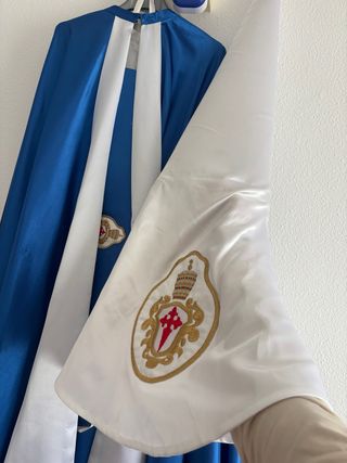 Vesta de lavatorio de Orihuela. - Diseño azul y blanco. - Detalle bordado con escudo. -Seminueva - Doble para sacar - Aproximadamente 1,57-1,60 + dobladillo que lleva para sacar -Todo bordado con escudo de la hermandad