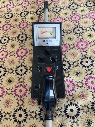 Detector de metales CS-150 con pantalla analógica y controles de sensibilidad y discriminación. - Indicador de sensibilidad con zonas de color (rojo, amarillo, verde). - Dial para ajuste de Ferrous y Non-Ferrous. - Dial para Discrimination con opciones OFF, IRON, TR2. - Dial para Sensitivity con ajuste MIN a MAX. - Botón PUSH AUTO TUNE en el mango. - Interruptor BATT TEST / OPERATE en el lateral.