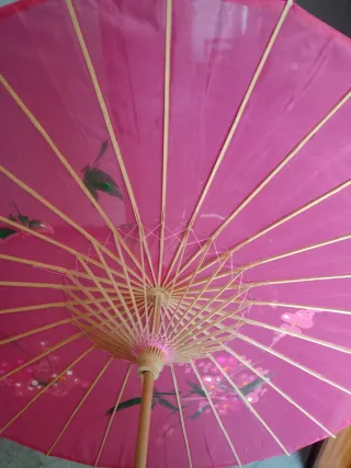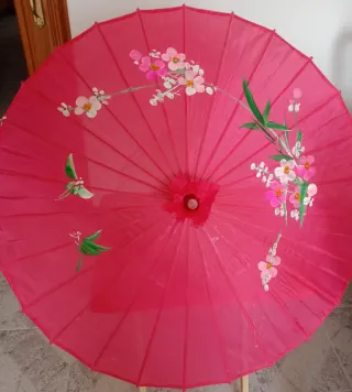 Bonita sombrilla de estilo japonés, perfecta como elemento decorativo. - Color rosa vibrante. - Decorada con flores y ramas. - Diseño oriental. - Varillas y mango de madera