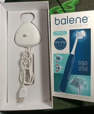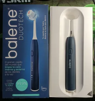 Cepillo de dientes eléctrico Balene Duotech en color azul marino. Incluye su caja original y cargador. - Tecnología de limpieza sónica avanzada. - Elimina el 99,9% de bacterias. - Cerdas Tyflex de larga duración. Viene sin el cabezal porque lo usé en 5 ocasiones (los recambios se pueden comprar en Amazon sin ningún problema. Está cómo nuevo.