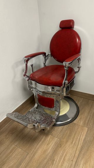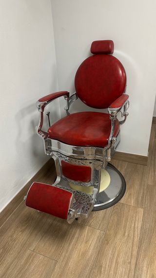 Sillón de barbería de estilo clásico, con un diseño retro y elegante. - Tapicería en color rojo. - Estructura metálica cromada. - Reposapiés. - Reposacabezas. Dispongo de 4