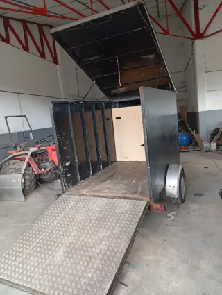 Remolque ligero cerrado de color negro, de 750 kg sin freno. Puerta trasera y lateral delantera para el compartimento delantero. Ideal para motos , quads , cargas grandes .. 212largo(hasta la división, aún es un poco más largo)x143ancho(a los listones de refuerzo)x150alto NO MAREANTES; Urge venta por otro más grande