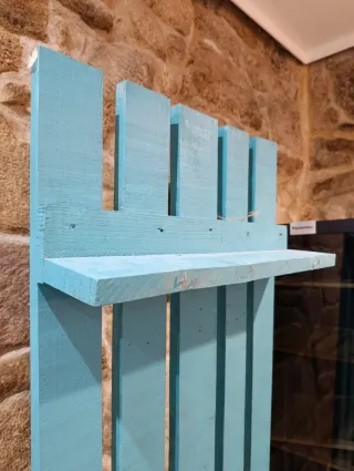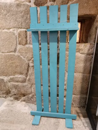 Estructura de madera pintada en color azul turquesa, ideal para colocar anuncios o como perchero. - Fabricado en madera. - Color azul turquesa. - Diseño vertical con listones. Se utilizó en un local/tienda para colgar anuncios. Vale como perchero, como separador. La pintura vale para exterior. Se entrega en Vigo - Ourense