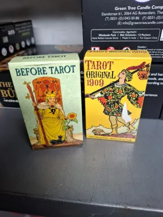 Lote de dos cajas de tarot. - Caja Before Tarot con ilustración de una figura sentada en un trono. - Caja Tarot Original 1909 con ilustración de un personaje con un bastón.