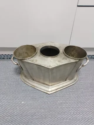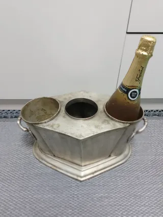 Cubitera o botellero antiguo . Para dos botellas y compartimento para hielo. - Fabricado en metal plateado. - Dos compartimentos. - Asas laterales.
