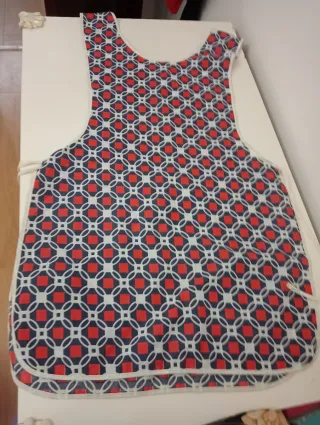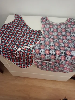 Conjunto de dos mandiles con estampados originales. Están en buen estado. - Mandil con estampado de rombos rojos y azules. - Mandil con estampado geométrico de círculos rosas y azules.