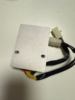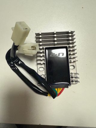 Regulador de voltaje con disipador de calor metálico y conectores de plástico. - Diseño con aletas para disipación. - Incluye cables de conexión.