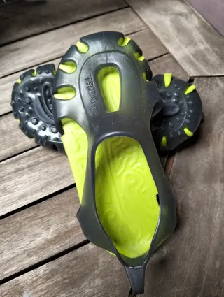 Cangrejeras para niño de la marca TRIBORD. - Suela de goma con tacos. - Diseño abierto y flexible. - Color verde lima y negro.