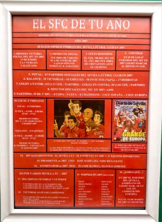 ¿Buscas un regalo original para un sevillista? Hazle un recuerdo único que une la historia del Sevilla FC con un año especial de tu/su vida (nacimiento, boda, el año de tu hijo, lo que desees...). Tú eliges el año y yo me encargo de crear esta lámina exclusiva con 20 datos imprescindibles de lo que hizo nuestro equipo en esa fecha. 630143956. SOLO WhatsApp ¿Cómo funciona? Me dices el año que te interesa. Preparo la información personalizada con el rigor que merece nuestra historia. Te entrego el cuadro montado y listo para colgar.