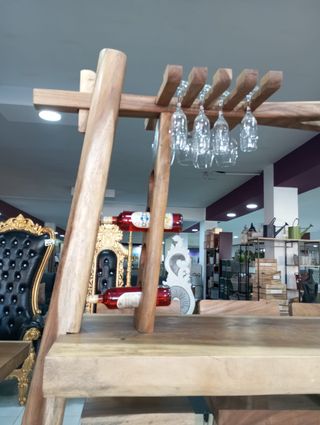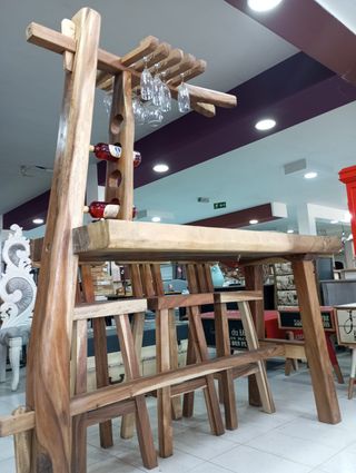 Conjunto de barra de bar de madera maciza con botellero y porta copas, e incluye sillas. - Barra de madera maciza. - Botellero integrado. - Soporte para copas. - Sillas a juego. Tienda física en valencia MOVIL 656339147 LUISA CARDONA Hacemos envíos contra reembolso en valencia , Alicante y Barcelona. Estoy ubicada en la Calle 13 rosas, 17 QUAR DE POBLET pregunta por luisa cardona Contamos con financiación de 3 , 6 y 12 NOTA: las sillas y la mesa tambien se pueden vender por separado. SILLAS 80 LA UNIDAD BARRA 500