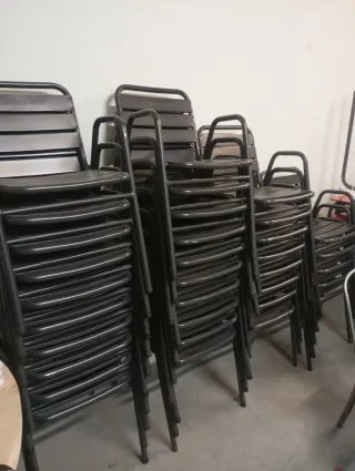 Lote de 20 sillas apilables de aluminio, perfectas para terrazas o bares. En las fotografías salen 30unidases, pero el lote consta de 20 unidades por 200€ -Sillas muy ligeras - Diseño moderno y funcional. - Estructura robusta para uso exterior. - Fácil de almacenar gracias a su diseño apilable. -No oxidan ya que son de aluminio. POR FAVOR OBSERVAR BIEN LAS IMÁGENES YA QUE FORMAN PARTE DE LA DESCRIPCIÓN