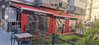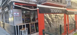 Oportunidad de traspaso de bar. - Fachada con toldos rojos y nombre del local TENDENCIA. - Zona de mesas exteriores con sillas y mesas. - Cartel SE TRASPASA visible. Teléfono de contacto: 698739338