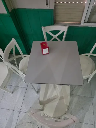 Conjunto de mesas y sillas para bar o terraza. - Mesas cuadradas con diseño de Pepsi Max. - Estructura de las mesas y sillas en metal blanco. - Ideal para exteriores. En total hay 10 juegos de mesa con sus sillas en buen estado podéis venir a por ellas aunque también se pu de hablar el transporte