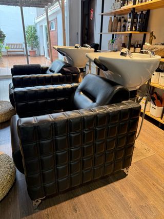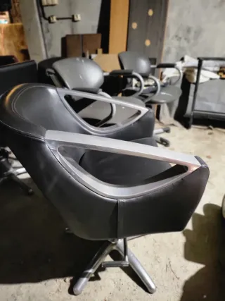 9 tocadores 10 sillas 6 lavacabezas 4 sillones de caballero y tres tocadores mas entrada y vitrinas también por separado - Sillones de cuero sintético negro. - Lavacabezas negros con grifería. - Reposabrazos de madera en los sillones.