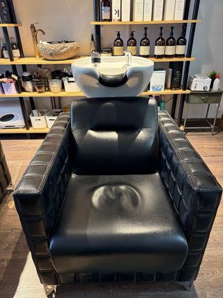Lavacabezas de diseño moderno, Lo vendo por no usar nada, tuene signos de desgaste en la pintura solo, no tiene nada roto y funciona a la perfeccion - Sillón reclinable con tapicería negra. - Lavabo blanco de cerámica. NO HAGO ENVIOS, SOLO RECOGIDA