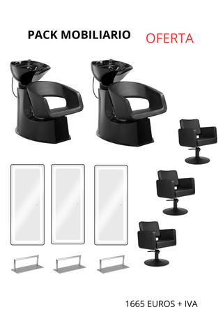 Pack de Mobiliario para peluquería en oferta. 1 Lavacabezas W-WISP. 2 Sillón Corte W-CHIC Q. 2 Tocador W-LUSH BLACK. 2 Reposapies W-SPINY MATE. Consultar envío. IVA no incluido.
