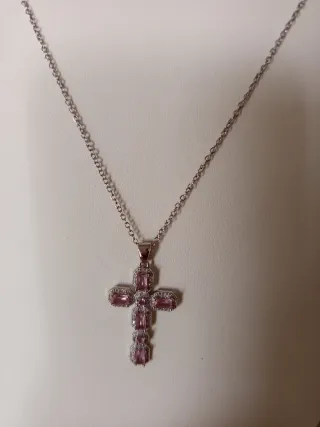 Elegante collar con colgante en forma de cruz, elaborado en acero inoxidable. El diseño presenta piedras de color rosa y detalles brillantes. - Colgante de cruz con piedras rosas. - Cadena de acero inoxidable.