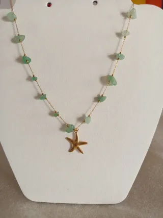 Elegante collar con un colgante de estrella de mar y pequeñas piedras verdes engarzadas. - Colgante de estrella de mar. - Piedras verdes. - Bisutería de acero inoxidable.