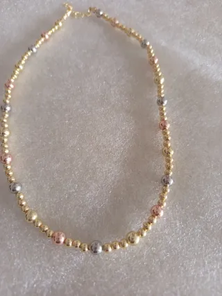 Elegante collar de bisutería con un diseño de cadena fina y dos colgantes en forma de cruz. Perfecto para añadir un toque especial a tu estilo. - Material: Acero inoxidable. - Diseño: Cadena con cuentas negras y dos cruces doradas.tipo rosario