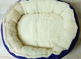 Acogedora cuna para mascotas con un divertido estampado. - Exterior de tela naranja acanalada. - Interior de pelo sintético blanco y suave. - Cojín central con diseño de corazones multicolores.