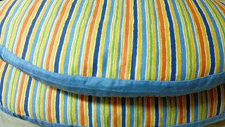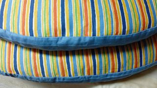 Colchoneta para perros con un diseño de rayas verticales en varios colores. El borde está rematado con una tela azul, tiene quemallera para lavar sol de esquina. - Diseño de rayas multicolores. - Borde de tela azul.