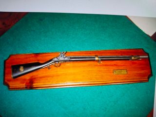 Réplica de un mini fusil de la época napoleónica, modelo 1804, montado sobre una base de madera. - Base de madera pulida. - Detalles metálicos. - Placa conmemorativa.