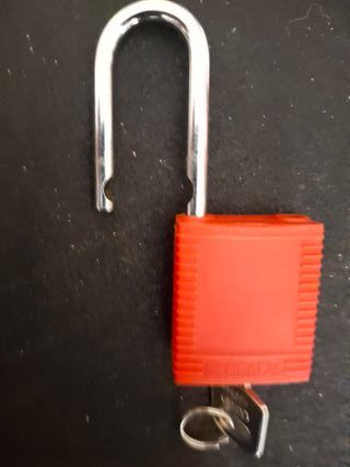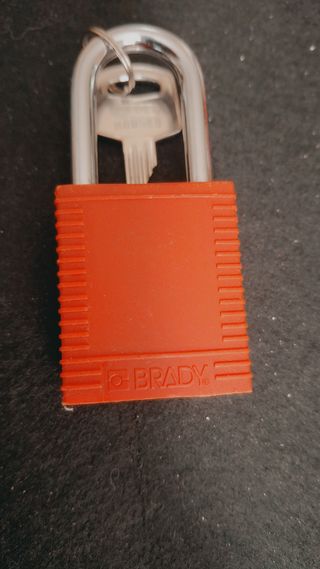 Candado de la marca Brady en color rojo. Incluye su llave para abrir y cerrar. - Cuerpo de plástico resistente.252711047TW - Grillete metálico. - Diseño de seguridad.