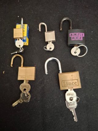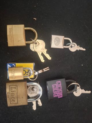 Lote de cinco candados variados, cada uno con su llave. -DE DIFERENTES MARCAS (252711048TW) - Candado Linse con llave. - Candado plateado pequeño con llave. - Candado negro con letras moradas y llave. - Candado pequeño dorado con llave.