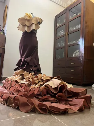 Bata de cola de flamenca con un diseño espectacular. - Cuerpo en tono marrón oscuro. - Volantes escalonados en la falda. - Combinación de colores marrón y beige en los volantes.