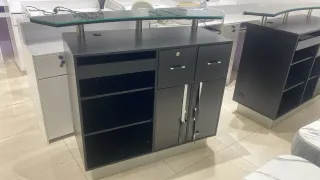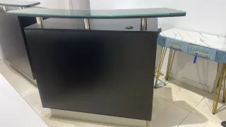 Mostrador de recepción moderno en color negro con superficie de cristal. - Diseño elegante y funcional. - Acabado en negro mate. - Cristal superior resistente. 120 cm de ancho