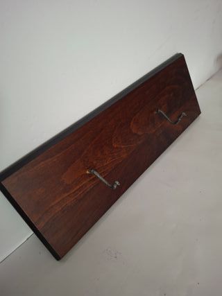 Este soporte de madera es ideal para colgar objetos en la pared. Su diseño rústico y elegante complementará cualquier decoración. (253011054TW) - Fabricado en madera con acabado oscuro. - Incluye dos ganchos metálicos.