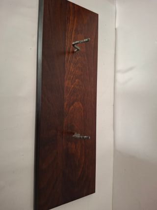 Expositor de madera para colgar dagas en la pared. Tiene un diseño octogonal y un acabado en madera oscura.mide ancho 15cm lalto 45,50cm - Dos soportes dorados para dagas. - Un pequeño gancho en la parte inferior.