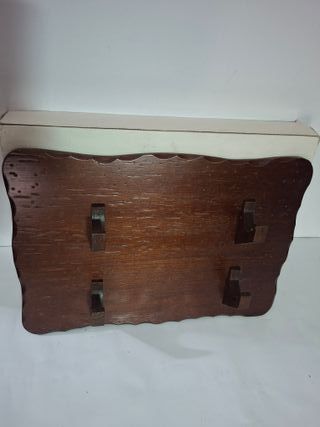 Este soporte de madera para pared cuenta con un diseño rústico y cuatro ganchos.mide ancho 42cm y 29 cm alto(253011055TW) - Fabricado en madera oscura. - Borde decorativo ondulado. - Cuatro ganchos metálicos.