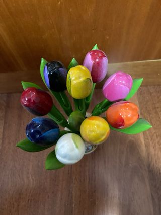 Conjunto de tulipanes de madera decorativos, perfectos para añadir un toque de color a cualquier espacio. Cada tulipán está pintado a mano con vivos colores. - Material: Madera. - Diseño: Tulipanes. - Base decorada con molino y Amsterdam.