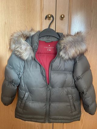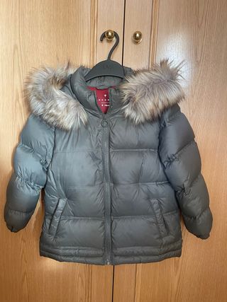Abrigo acolchado de niña de la marca OVS, ideal para el frío. - Color gris. - Capucha con pelo sintético. - Cierre de cremallera.