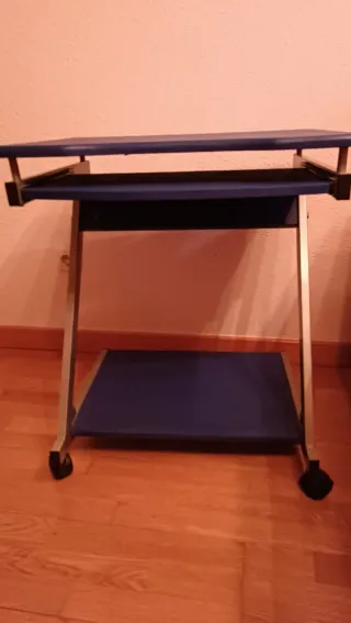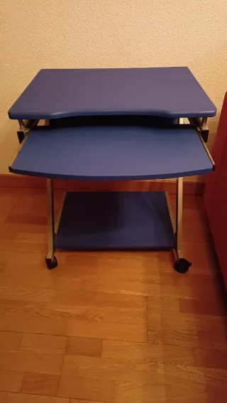 Mesa compacta para ordenador, ideal para espacios reducidos. Su diseño moderno en color azul le da un toque distintivo. - Bandeja extraíble para teclado. - Estante inferior para almacenamiento. - Ruedas para facilitar su movilidad.