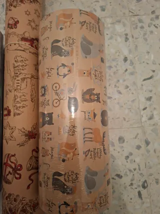 Conjunto de cuatro rollos de papel de regalo con motivos navideños. Se venden por separado Consultar - Papel con diseño de árboles de Navidad y copos de nieve en tonos oscuros. - Papel con diseño de escenas invernales y renos en tonos claros. - Papel con diseño de adornos y motivos navideños en color marrón. - Papel con diseño de gatos y adornos en color marrón.