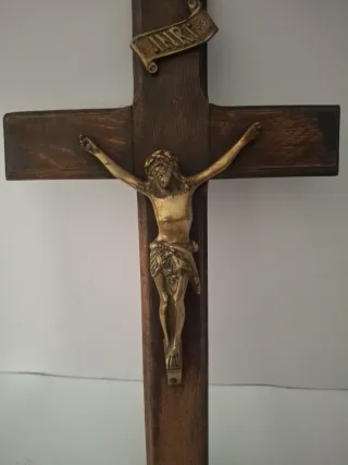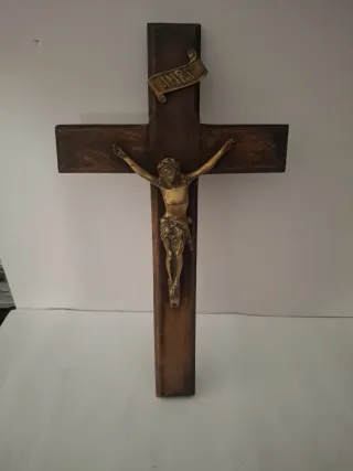 Crucifijo de madera con figura de Jesús en bronce. - Diseño clásico. - Inscripción INRI en la parte superior.(190707557TW)