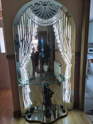 Elegante entradita con espejo de estilo romántico. A recoger en san Fernando de Henares - Cristal de alta calidad. - Diseño con espejo decorado. - Estante de cristal. Con luz Medidas: 1,05 x 2,05