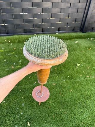 Posadero para halcones con base de madera y césped artificial. - Base de madera con acabado rústico. - Superficie superior con césped artificial. - Soporte metálico con base circular.