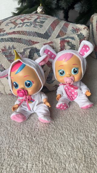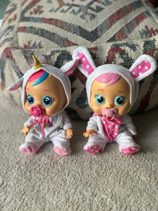Dos adorables muñecas Cry Babies vestidas con pijamas de animalitos. - Una muñeca con pijama de unicornio y cuerno. - Otra muñeca con pijama de conejito y orejas. - Ambas llevan chupete rosa.