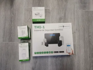 Sistema de seguridad domótico THI-1 de Tuhogarante.com. - Incluye panel de control, detector de inundación, detector de movimiento inmune a mascotas y sensores de apertura para puertas y ventanas. - Compatible con App Store y Google Play.